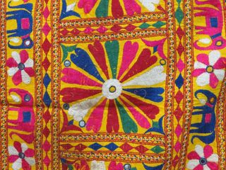 This brilliant vintage antique tribal wall hanging or throw was previously used as a Cow Quilt, used to decorate cows on auspicious days. Exquisite intricate heavy "Banjara" hand embroidery in silk & linen threads and large mirror work from the states of Rajasthan & Gujarat in Western India.