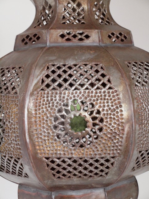 A beautiful oxidized tin lantern with coloured glass pieces. Handcrafted in Marrakech, Morocco by skilled artisans. Puts out a beautiful filigree pattern if you use a clear light bulb.