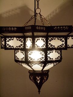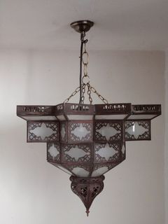 A beautiful oxidized tin lantern with glass panes handcrafted in Marrakech, Morocco.