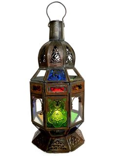 A blue, red, yellow, green and clear handcrafted tin moroccan lamp suitable for tea candles or small pillar candles. Use an oil of citronalla candle for your next BBQ and they will provide you with some Moroccan vibes. A very traditional moroccan style candle lantern. You can also have it wired for electric if you want.