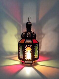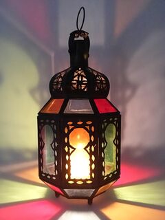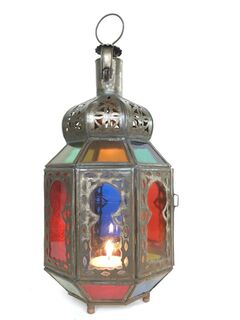 A blue, red, yellow & green handcrafted tin moroccan lamp suitable for tea candles or small pillar candles. Use an oil of citronalla candle for your next BBQ and they will provide you with some Moroccan vibes. A very traditional moroccan style candle lantern. You can also have it wired for electric if you want.