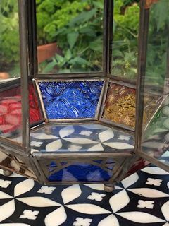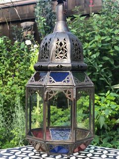 An oxidized tin lantern which can be used either as a hanging lantern or as a candle lamp. Has panes of red, yellow, blue, green and clear glass bottom. A very traditional style lantern handcrafted in Marrakech.