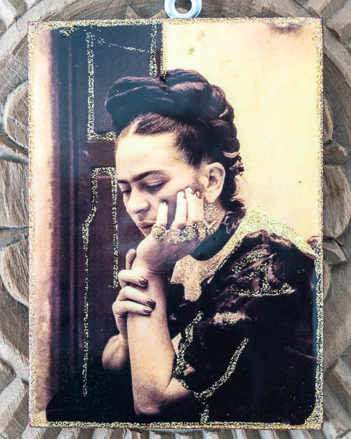 A small wall plaque graphic of Frida Kahlo on timber.