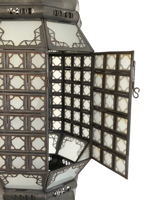 A beautiful large oxidized tin lantern with glass panes handcrafted in Marrakech, Morocco. Puts out a beautiful filigree pattern if you use a clear light bulb. Has panes of white & red glass.