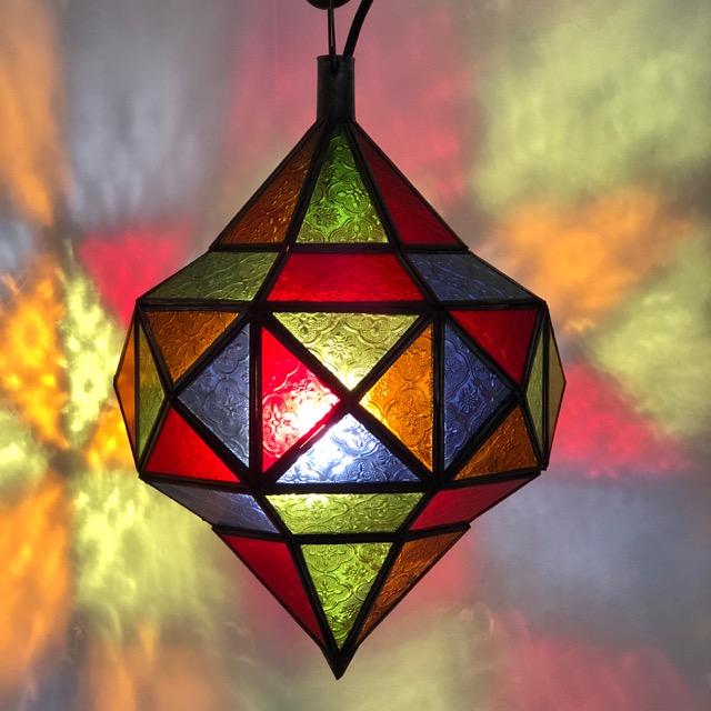 This beautiful lantern is totally handcrafted by a skilled artisan in Marrakech, Morocco. The glass is moorish patterned red, yellow, green & blue. Add some arabian nights groove to your room. A great light for ambiance.