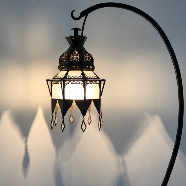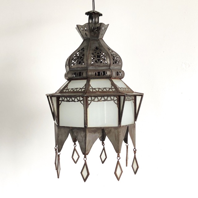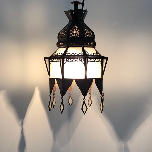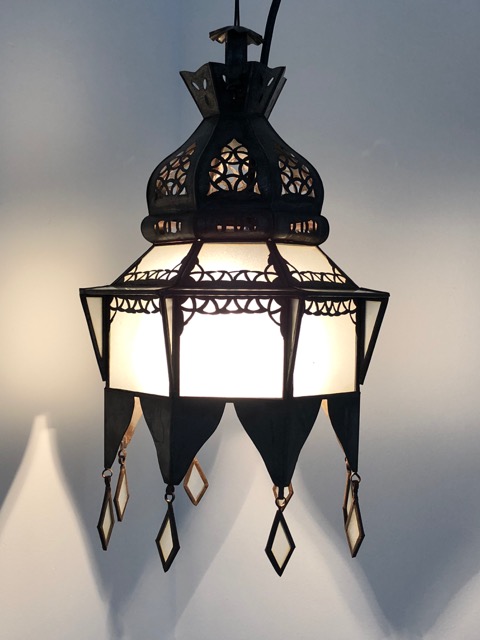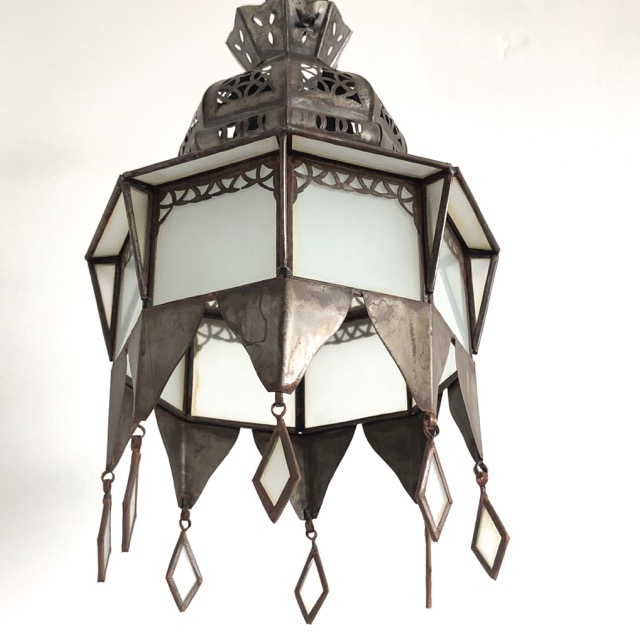 This beautiful lantern is totally handcrafted by a skilled artisan in Marrakech, Morocco. The glass is white. Add some arabian nights groove to your room. A great light for ambiance.