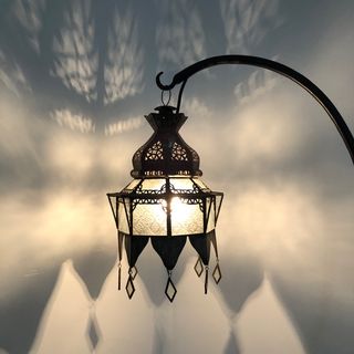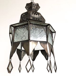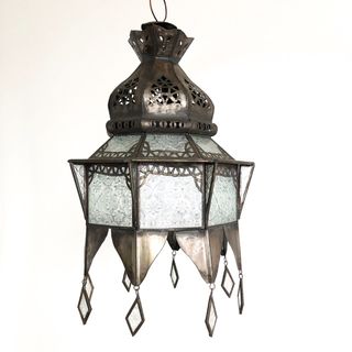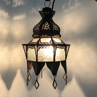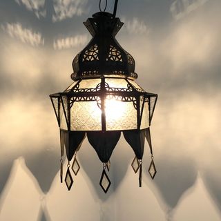 This beautiful lantern is totally handcrafted by a skilled artisan in Marrakech, Morocco. The glass is moorish patterned clear. Add some arabian nights groove to your room. A great light for ambiance.