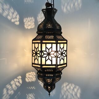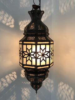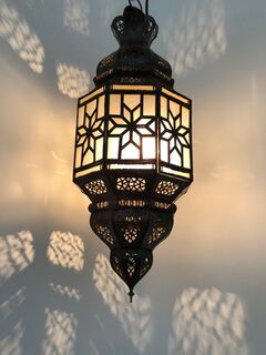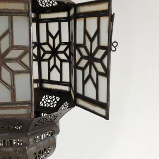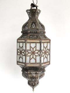 A beautiful oxidized tin lantern with glass panes handcrafted in Marrakech, Morocco by skilled artisans. Puts out a beautiful filigree pattern if you use a clear light bulb. Has panes of white glass.
