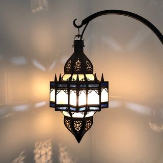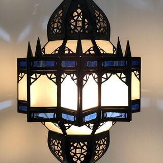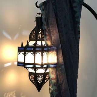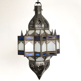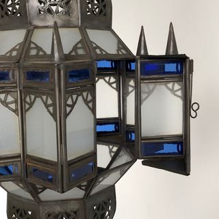 This beautiful lantern is totally handcrafted by a skilled artisan in Marrakech, Morocco. The glass is blue and white. Add some arabian nights groove to your room. A great light for ambiance.
