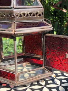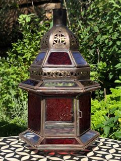 An oxidized tin lantern which can be used either as a hanging lantern or as a candle lamp. Has panes of red, yellow, blue, green and clear glass bottom. A very traditional style lantern handcrafted in the souks of Marrakech by skilled artisans.