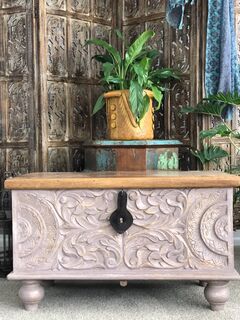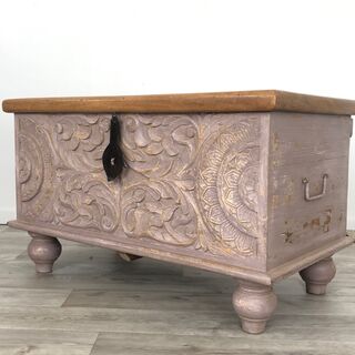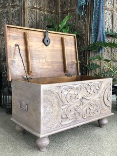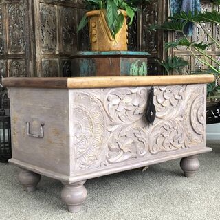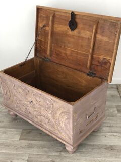 A decorative handcrafted blanket box with beautifully hand carved timber detailing. Made from sustainable mango wood.
