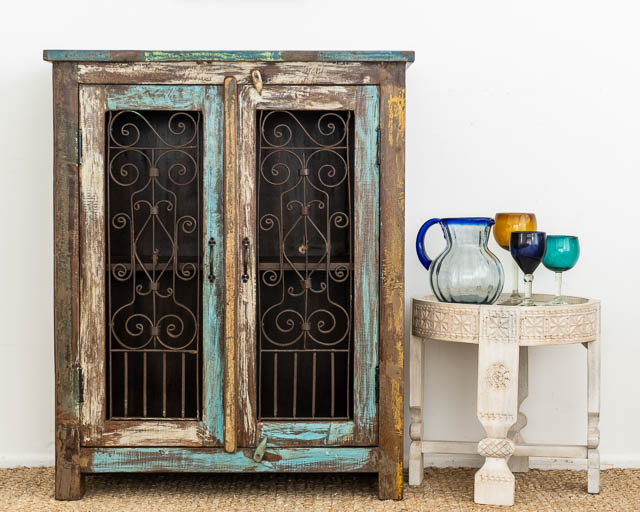 A super rustic sideboard made from reclaimed wood with iron jali doors. Each one may have slight variations to the one pictured.