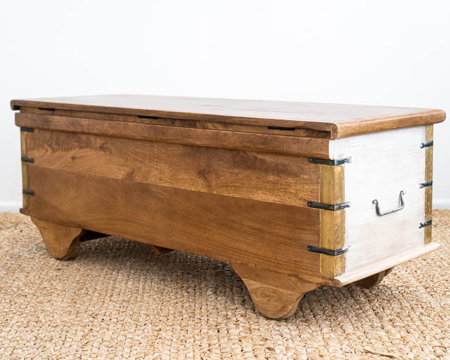 A gorgeous handcrafted blanket box with beautifully hand carved brass detailing.