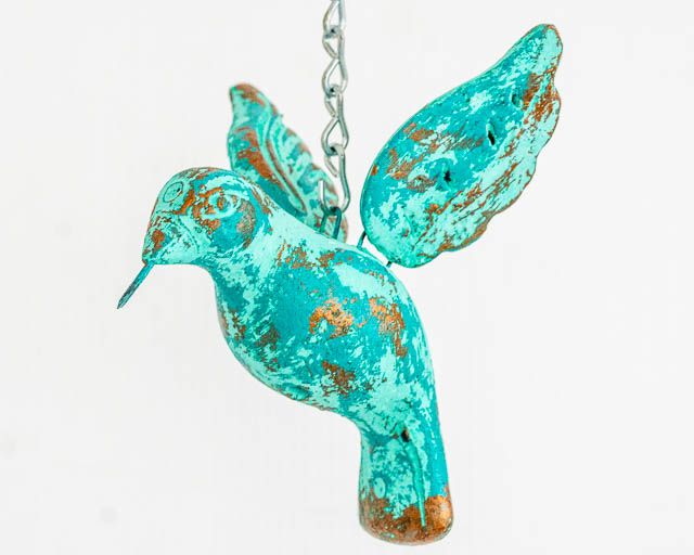 A beautiful turquoise clay hummingbird from Mexico handcrafted by skilled artisans. It has a small metal loop on its back so you can hang it.