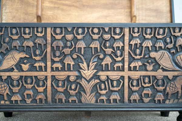 A gorgeous handcrafted blanket box with beautifully hand carved timber detailing.