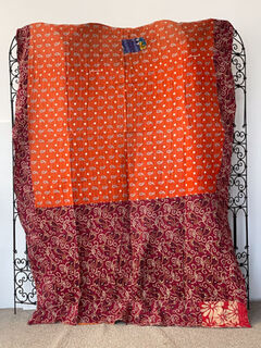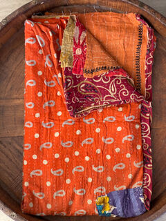 These vintage kantha quilts are a thin, double sided cotton quilt hand crafted in Rajasthan. They are made from old saris, scraps of left over textiles and each one is unique. Most of them will have small patches sewn over to patch small holes. They commonly have some loose or uneven stitching and old stains on the fabric. This is all part of the beauty of a handcrafted vintage kantha. Very awesome quilts!!