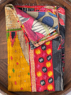 These vintage kantha quilts are a thin, double sided cotton quilt hand crafted in Rajasthan. They are made from old saris, scraps of left over textiles and each one is unique. Most of them will have small patches sewn over to patch small holes. They commonly have some loose or uneven stitching and old stains on the fabric. This is all part of the beauty of a handcrafted vintage kantha. Very awesome quilts!!