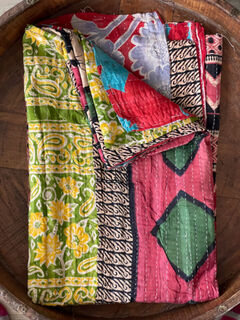 These vintage kantha quilts are a thin, double sided cotton quilt hand crafted in Rajasthan. They are made from old saris, scraps of left over textiles and each one is unique. Most of them will have small patches sewn over to patch small holes. They commonly have some loose or uneven stitching and old stains on the fabric. This is all part of the beauty of a handcrafted vintage kantha. Very awesome quilts!!