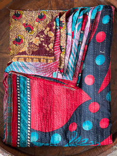 These vintage kantha quilts are a thin, double sided cotton quilt hand crafted in Rajasthan. They are made from old saris, scraps of left over textiles and each one is unique. Most of them will have small patches sewn over to patch small holes. They commonly have some loose or uneven stitching and old stains on the fabric. This is all part of the beauty of a handcrafted vintage kantha. Very awesome quilts!!