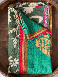 These vintage kantha quilts are a thin, double sided cotton quilt hand crafted in Rajasthan. They are made from old saris, scraps of left over textiles and each one is unique. Most of them will have small patches sewn over to patch small holes. They commonly have some loose or uneven stitching and old stains on the fabric. This is all part of the beauty of a handcrafted vintage kantha. Very awesome quilts!!