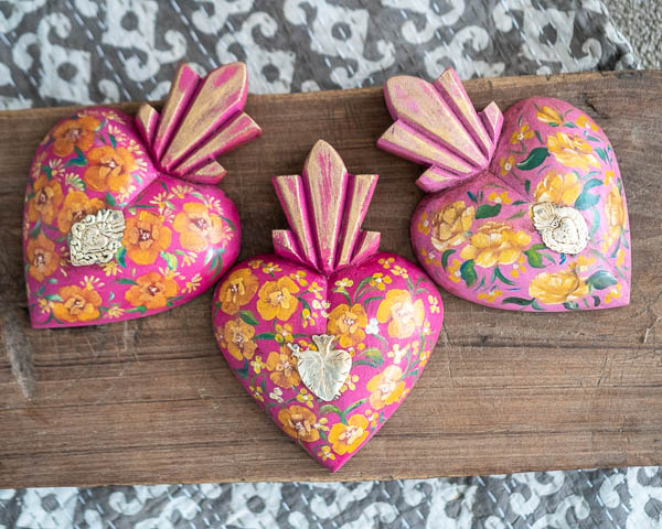 A wonderful handcrafted wooden heart with Milagros, or tiny miracles, are small religious charms that have been used in Mexico for hundreds of years for healing, protection and as a ritual offering to the saints.