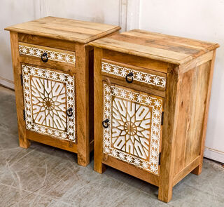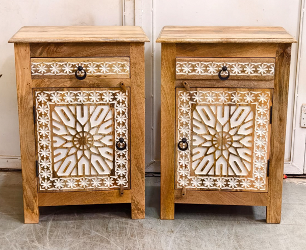 A wonderful bohemian style bedside table with beautifully detailed hand carving work.