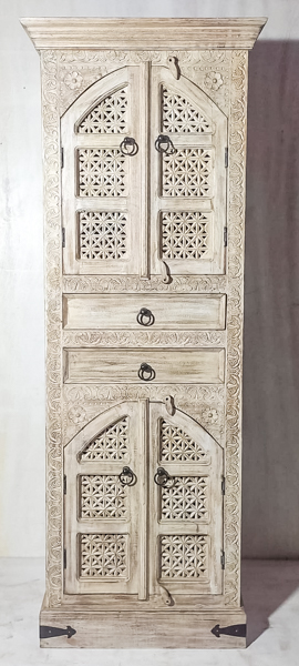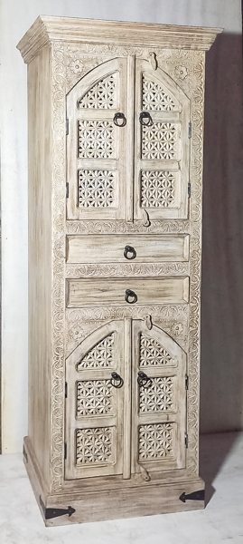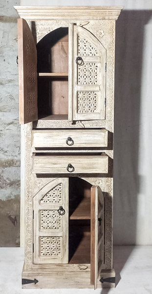 A stunning reclaimed wood tallboy cabinet, handcrafted in India with intricate hand carved detailing and elegant lattice doors. This tall storage cabinet is ideal for stylish organisation in the bedroom, hallway, or living room. The tallboy’s warm, rustic character and artisan finish make it perfect for displaying favourite treasures while keeping essentials neatly stored. A unique statement piece of wooden furniture for boho, vintage, and modern interiors.