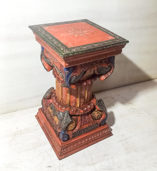 Beautiful hand carved pillar works as a side table, accent stool, or sculptural decor stand. The detailed craftsmanship and natural wood texture bring coastal, bohemian, and rustic styling to living rooms, bedrooms, and entryways. Made from solid wood, it is very heavy, durable, and built to last. Ideal for buyers searching for handcrafted Indian furniture and unique timber side tables.