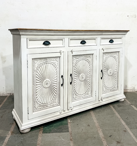 Dayita Sideboard White is a stunning, one-of-a-kind sideboard handcrafted from sustainable mango wood with hand-carved detailing and a soft whitewash finish. Handmade in India, this hardwood sideboard offers beautiful natural grain, practical storage, and timeless style for living rooms, dining rooms, and entryways. A perfect statement piece for modern, coastal, boho, or farmhouse interiors, it brings warmth and character to any home. ♥️