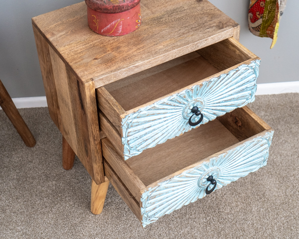 A wonderful bohemian style bedside table with beautifully detailed hand carving work.