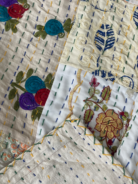 Kantha patchwork quilts commonly have some loose or uneven stitching. This is all part of the beauty of a handcrafted product. Very awesome quilts!!
