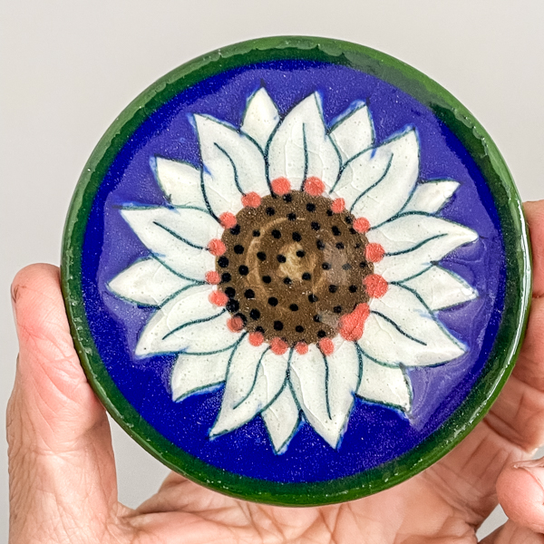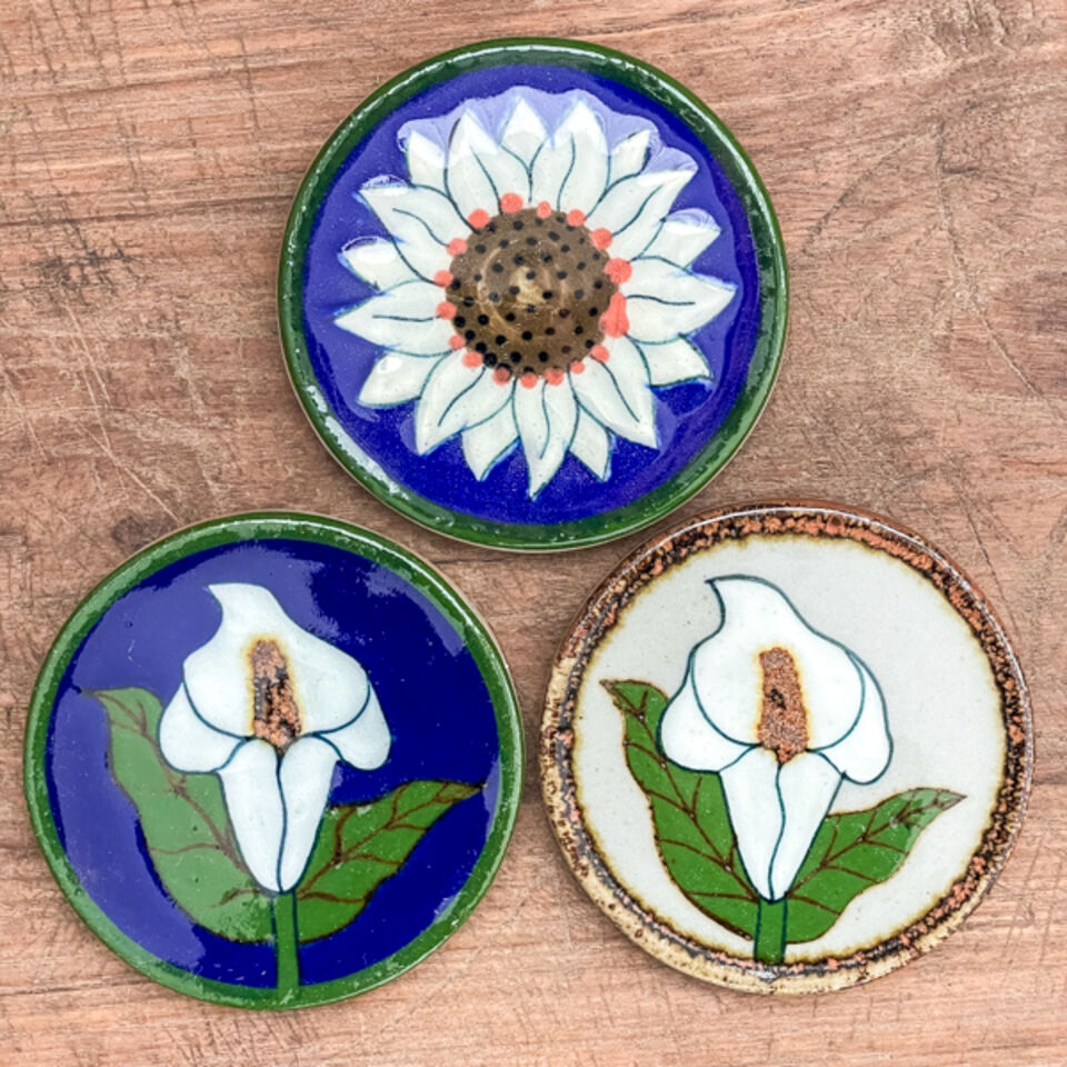 A beautiful whimsical Mexican Tonala stoneware tile, hand painted and handcrafted in Mexico with distinctive raised relief detailing. Measuring 85mm x 85mm x 10mm thick, this decorative ceramic tile adds authentic Mexican style to kitchen backsplashes, bathrooms, fireplace surrounds, and feature walls. The charming design brings colour and artisan character to any space, and it also works perfectly as a stylish coaster. Ideal for collectors and interior designers seeking handmade Mexican tiles, Talavera-style decor, and unique artisan home accents.