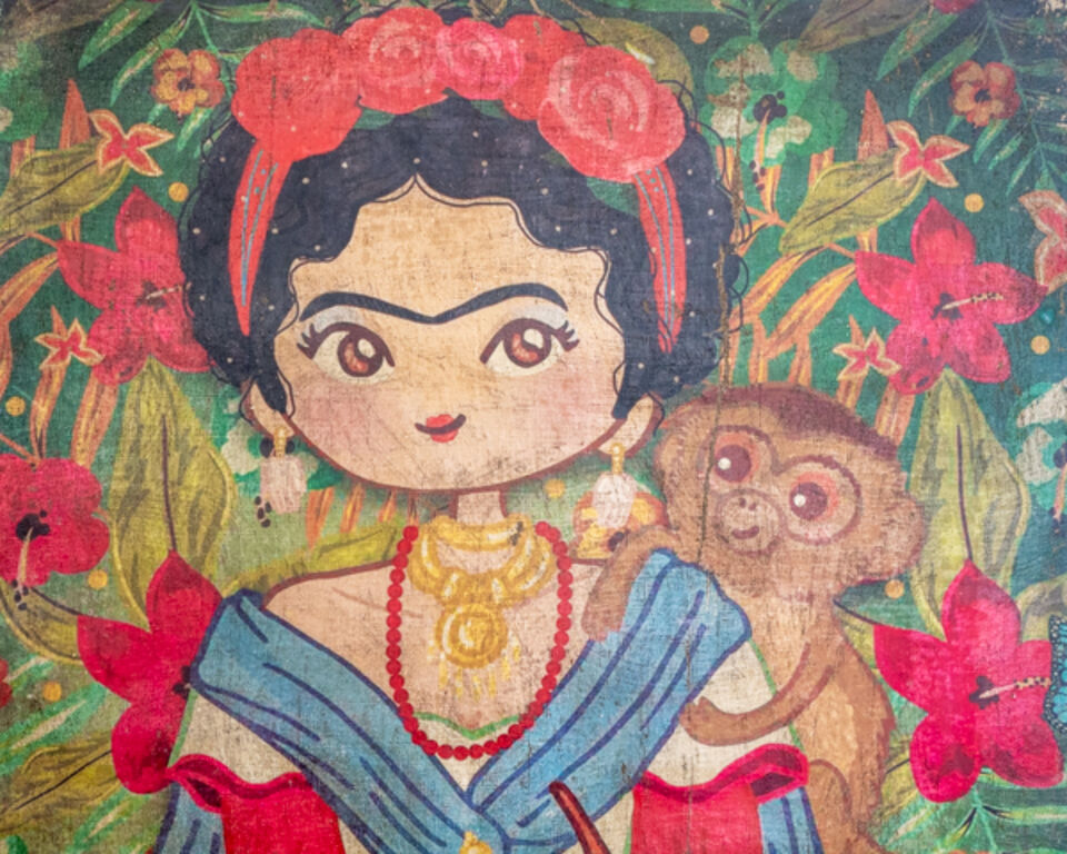 A stretched screen printed canvas of Frida Kahlo on a timber backing. These are very rustic prints with crackling effect on the canvas.