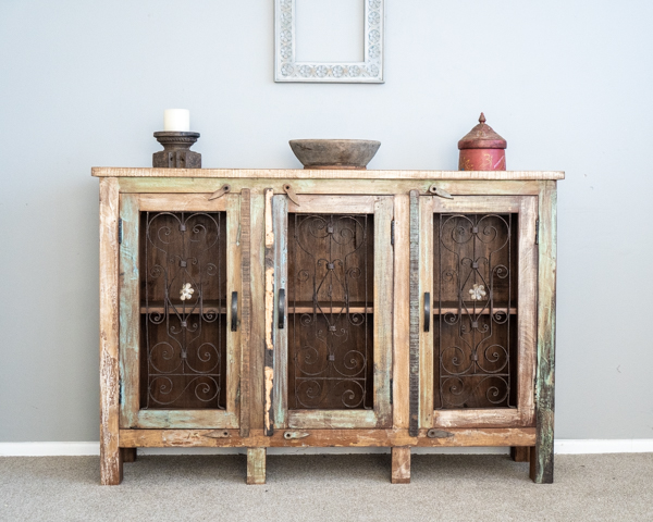 A super rustic sideboard made from reclaimed wood with iron jali doors. Perfect for storing your favourite treasures. Could also make a lovely unique bathroom vanity.