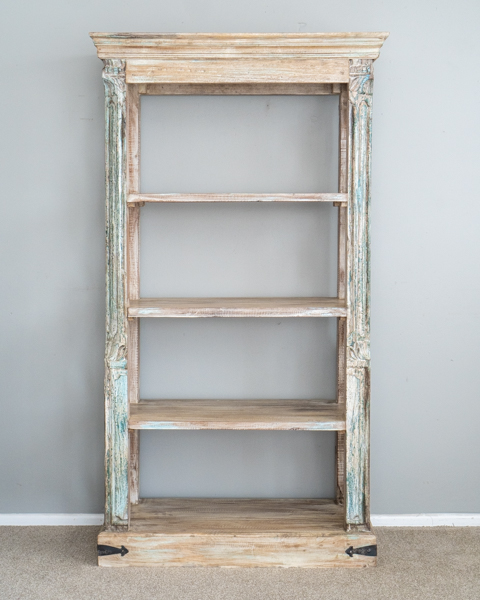 An utterly fabulous timber bookcase made from reclaimed timber with hand carved detailing.