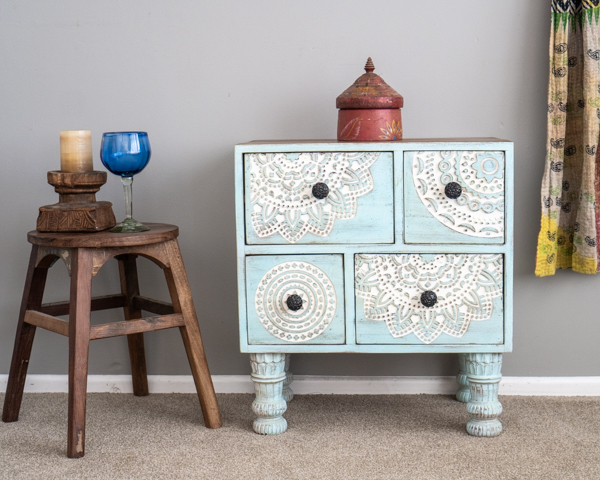A wonderful bohemian style bedside table with beautifully detailed hand carving work.