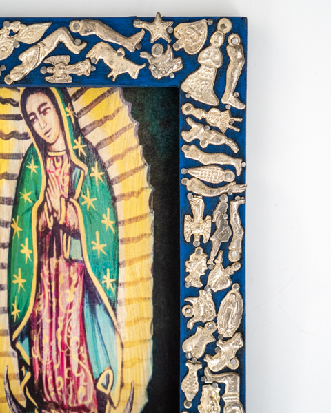 A wonderful handcrafted wooden frame covered with Milagros, or tiny miracles, are small religious charms that have been used in Mexico for hundreds of years for healing, protection and as a ritual offering to the saints.