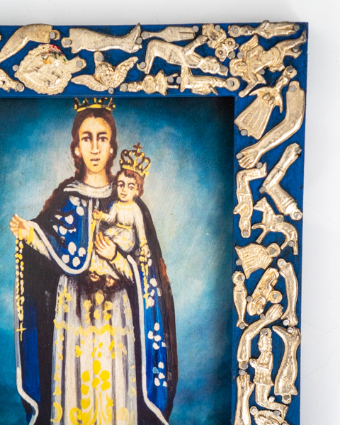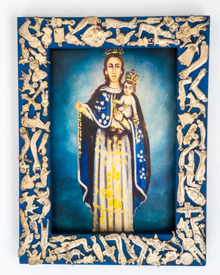 A wonderful handcrafted wooden frame covered with Milagros, or tiny miracles, are small religious charms that have been used in Mexico for hundreds of years for healing, protection and as a ritual offering to the saints.