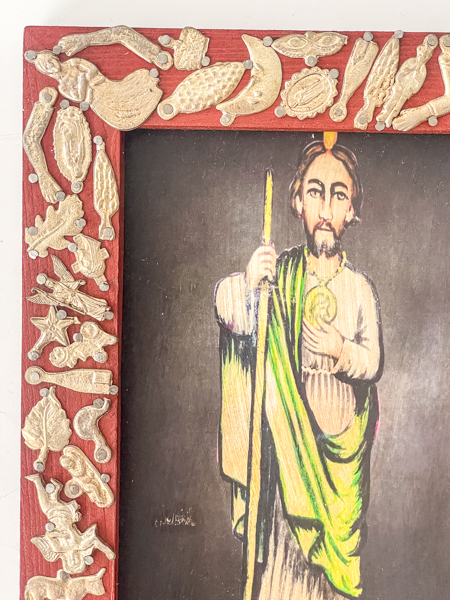 A wonderful handcrafted wooden frame covered with Milagros, or tiny miracles, are small religious charms that have been used in Mexico for hundreds of years for healing, protection and as a ritual offering to the saints.