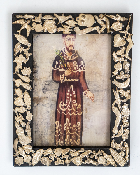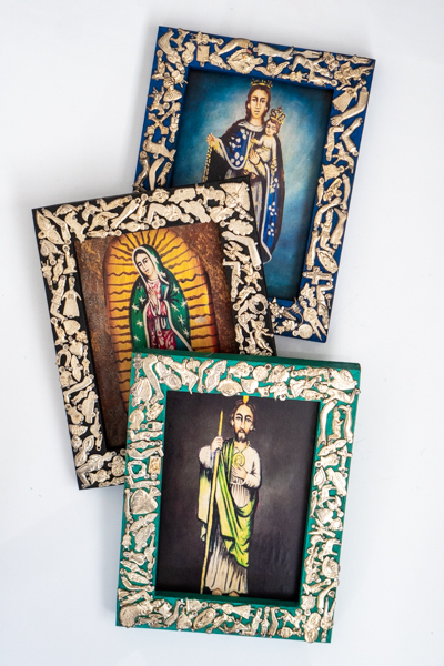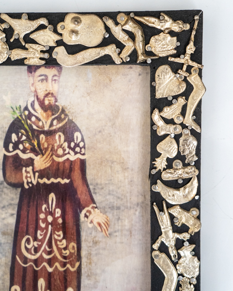 A wonderful handcrafted wooden frame covered with Milagros, or tiny miracles, are small religious charms that have been used in Mexico for hundreds of years for healing, protection and as a ritual offering to the saints.