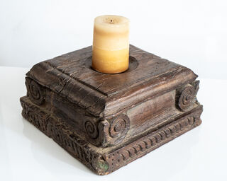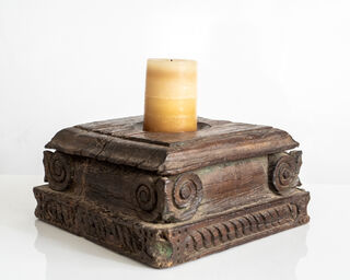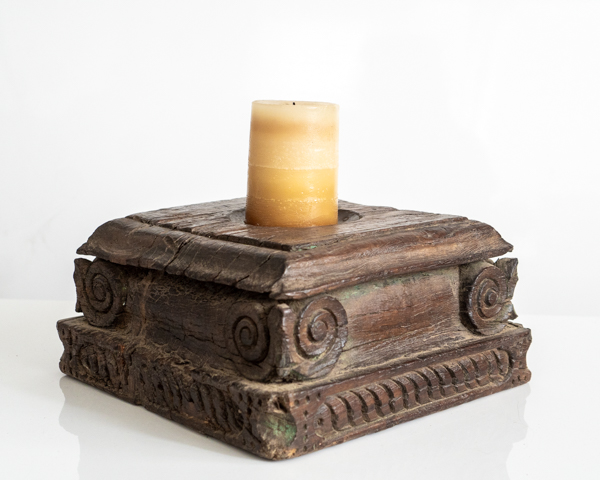 Enhance your home decor with this exquisite rustic pillar candle stand, meticulously handcrafted from reclaimed teak wood and imported directly from India. This unique candle stand is the perfect size to hold your favorite pillar candles, providing both stability and style. Each piece showcases beautiful hand carved detailing, giving it a distinctive character and charm that reflects expert Indian craftsmanship.