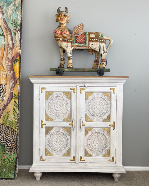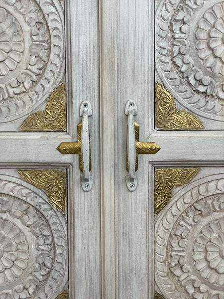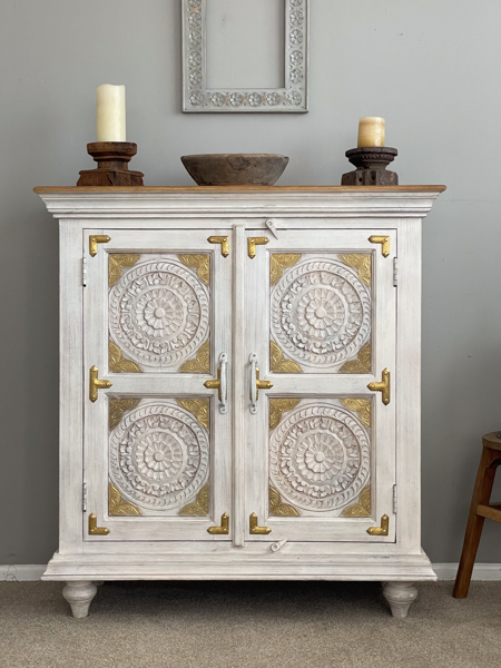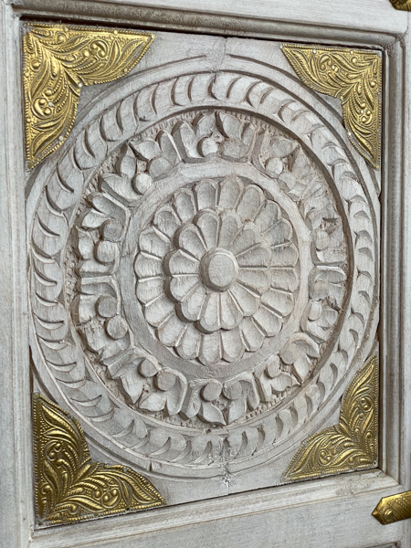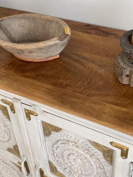 An utterly gorgeous and elegant sideboard with beautiful hand carved decorative design and beaten brass.