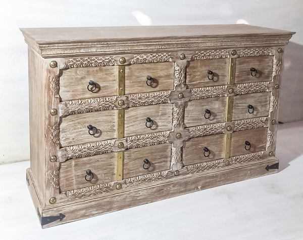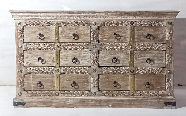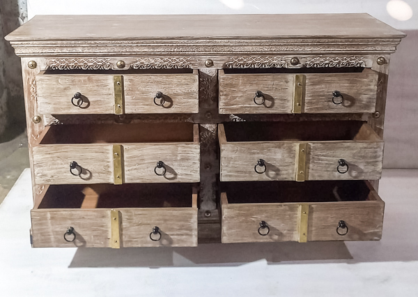 A rustic sideboard and storage cabinet handcrafted in India from reclaimed timber with elegant brass detailing, it offers generous drawer storage for dining rooms, living spaces, or entryways. The natural wood grain and aged finish bring warmth and character, making it ideal for farmhouse, boho, and industrial interiors. A statement piece of handcrafted furniture, perfect as a buffet, credenza, or hallway console while adding practical storage and timeless style.