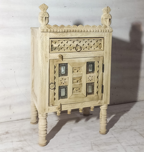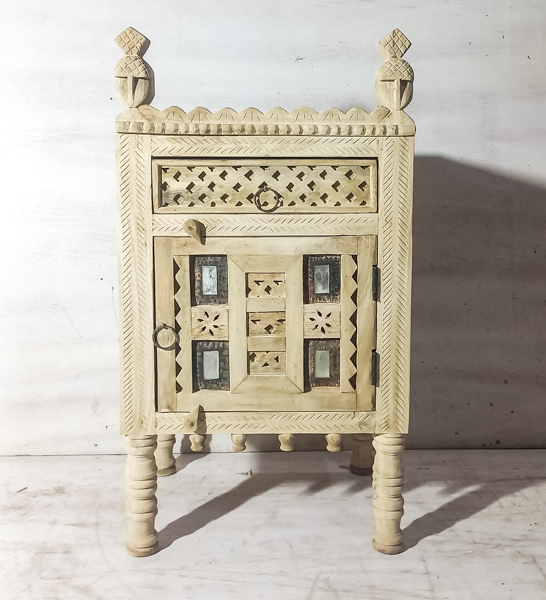 A stunning handcrafted Indian bedside table featuring mirrored panels and intricate hand carved detailing. With an ethnic, vintage-inspired look, this unique side table adds character to any bedroom, living room, or entryway, it’s ideal as a nightstand, lamp table, or accent furniture piece. Made in India with artisan craftsmanship, this rustic wooden side table suits boho, eclectic, and farmhouse interiors while offering practical surface space and statement style.
