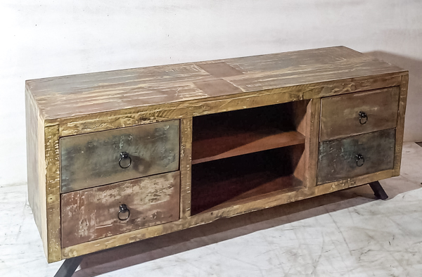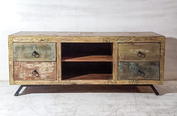This brings rustic-inspired character to your living room, this industrial TV unit combines reclaimed timber with strong metalwork for a rugged, rustic finish. Featuring 4 spacious drawers, it’s ideal for storing remotes, consoles, and media accessories while keeping your entertainment area tidy. Handcrafted in India, each wooden TV cabinet showcases unique grain and texture, making it a standout piece of industrial furniture and rustic living room storage.