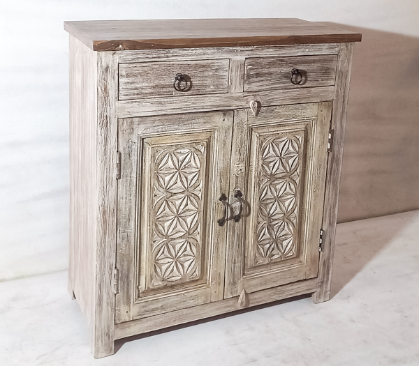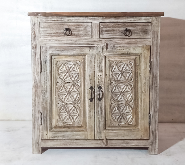 Bring character and storage to your home with this handcrafted sideboard made from reclaimed teak, combining rustic warmth with artisanal detail. The hand carved pattern adds a striking boho, coastal, or modern farmhouse touch to any dining room, hallway, or living space. Crafted in India, it’s ideal as a buffet cabinet, entryway console, or statement storage furniture with unique natural grain variations.