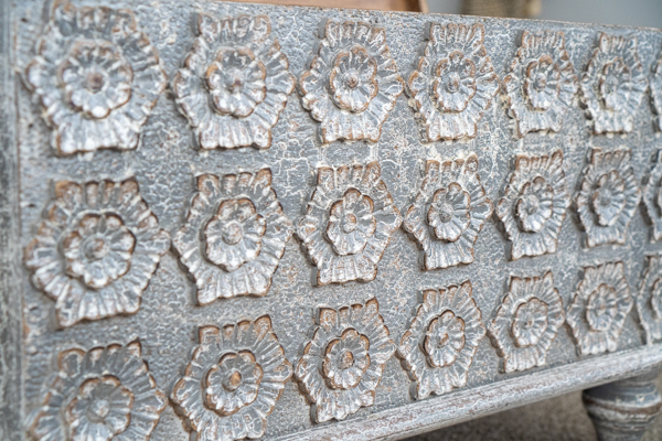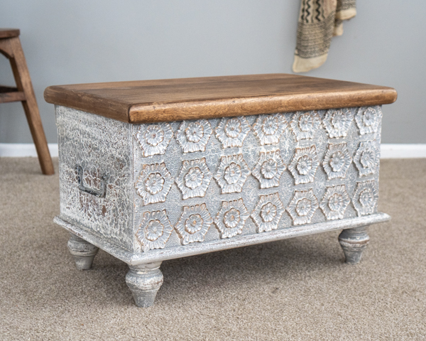 A gorgeous handcrafted blanket box with beautifully hand carved timber detailing.