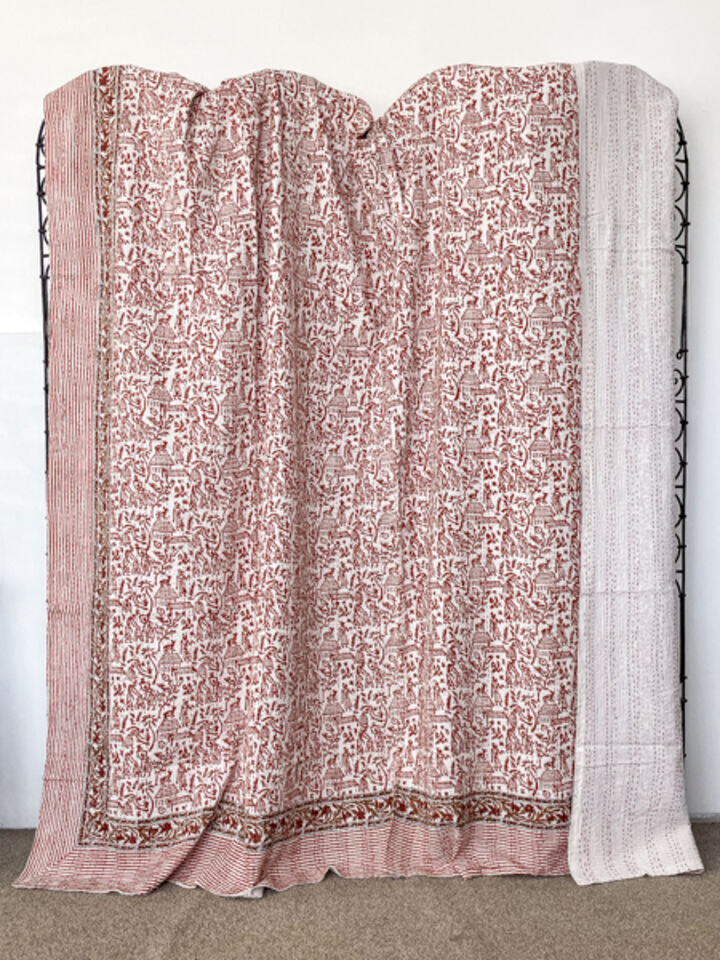 Add artisanal warmth to your space with a double layer Block Print Kantha Quilt. Handcrafted in Rajasthan, this thin, double-sided cotton kantha quilt features traditional block print patterns and authentic hand-stitched detailing. It suits a queen or king size bed and works beautifully as a kantha throw or lightweight bedspread. Expect charming loose or uneven stitching, a hallmark of genuine handmade kantha quilts. Easy care: machine wash cold. Perfect for boho, vintage, and global-inspired home décor.