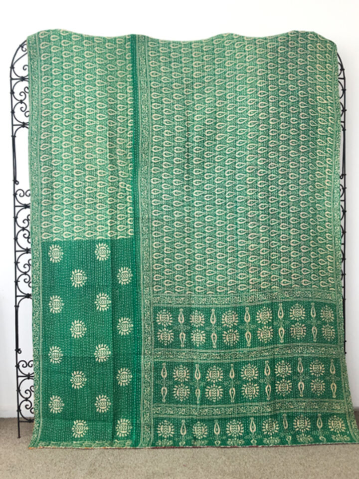 These vintage kantha quilts are a thin, double sided cotton quilt hand crafted in Rajasthan. They are made from old saris, scraps of left over textiles and each one is unique. Most of them will have small patches sewn over to patch small holes. They commonly have some loose or uneven stitching and old stains on the fabric. This is all part of the beauty of a handcrafted vintage kantha. Very awesome quilts!!